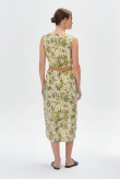 Kremowo-zielona sukienka z paskiem z rafii. Model bez rękawów, z dekoltem v-