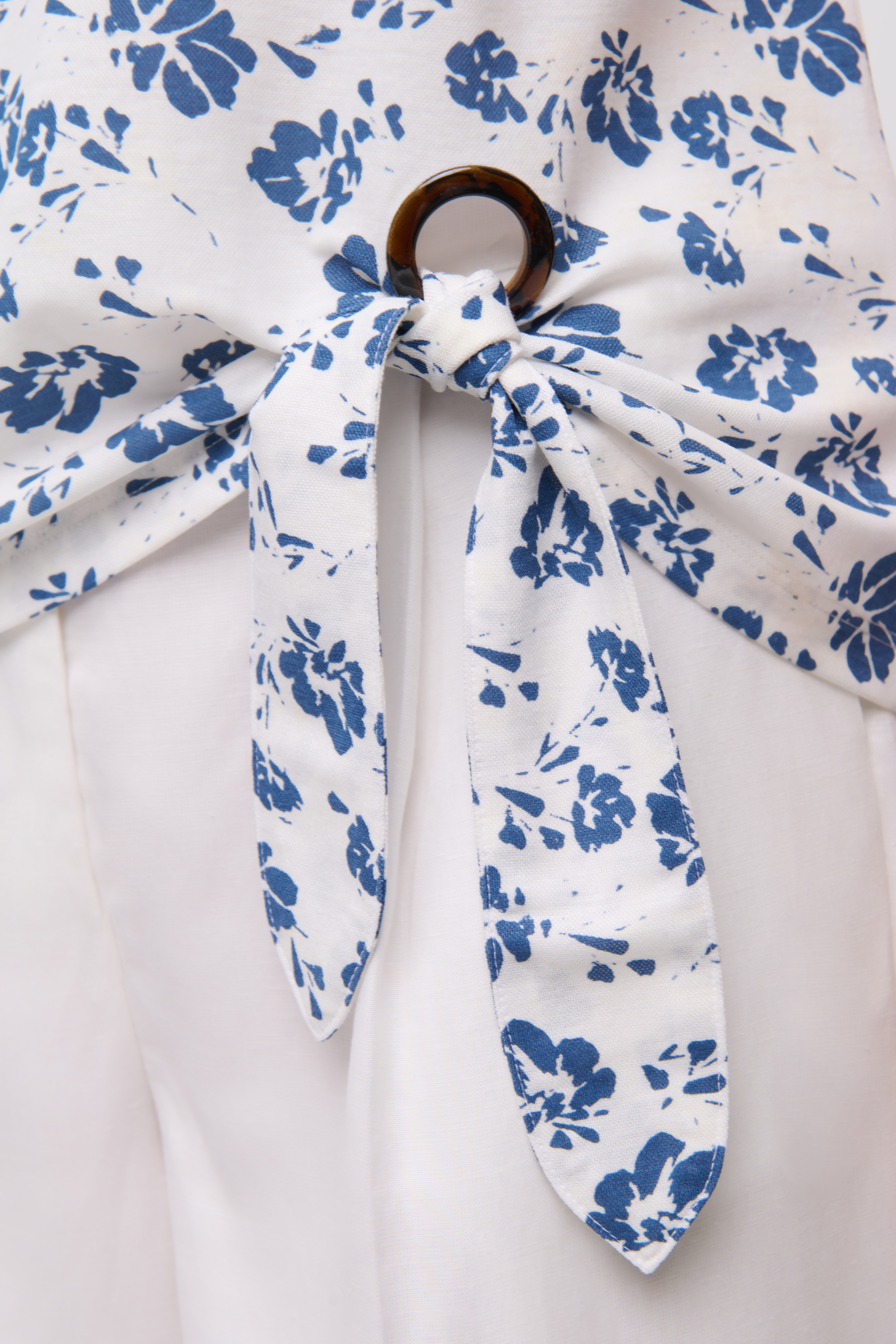 Top w kwiatowy wzór. Model z krótkim rękawem i półokrągłym dekoltem. U dołu